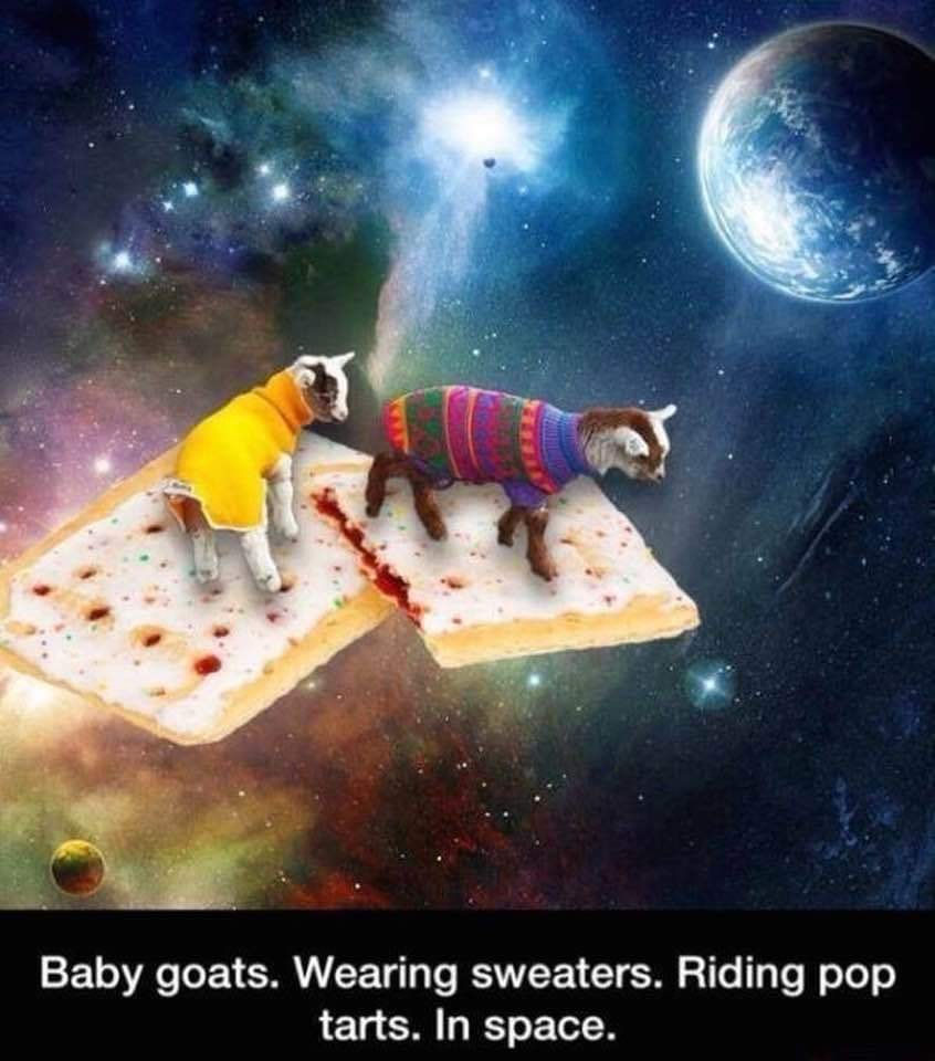 “Here’s the last thing. I-n stop. S-p-a-c-e.” Fred stared at her. “Baby goats, in sweaters, on pop tarts in space! We’ve got to run for cover.”